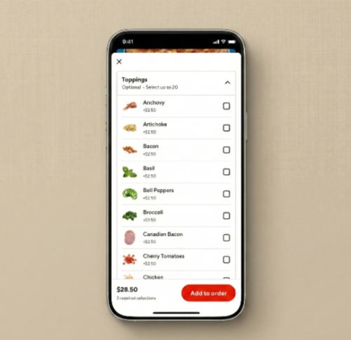 Persistent customization, so selected toppings remain in place when customers adjust size or crust, reducing abandoned carts and improving the user experience.